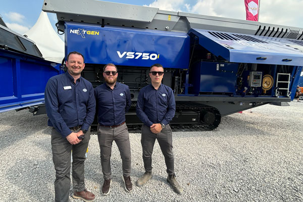 Edge Innovate, yet another Hillhead exhibitor, debuted its VS750i primary waste shredder at the show. Marketing manager Adrian Donnelly (left), territory sales manager Steven Conway (center) and territory sales manager Francis Sherry were among the Edge Innovate representatives on hand to unveil the plant and discuss other company developments.