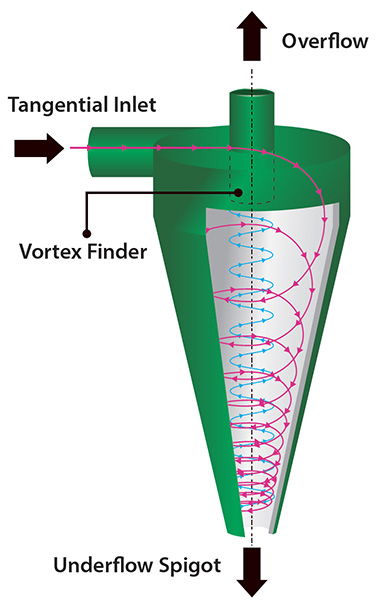 Essentially, the pressure of the fluid entering the cyclone generates the centrifugal forces that separate the solid and liquid phases within the device, whereby the heavier particles are flung outward from the central axis, flow in a spiral motion against the conical body section of the cyclone, and dragged into the underflow of the cyclone. The lighter, more fluid portion of the flow is directed to the central axis of the cyclone, and spirals upward into the overflow.